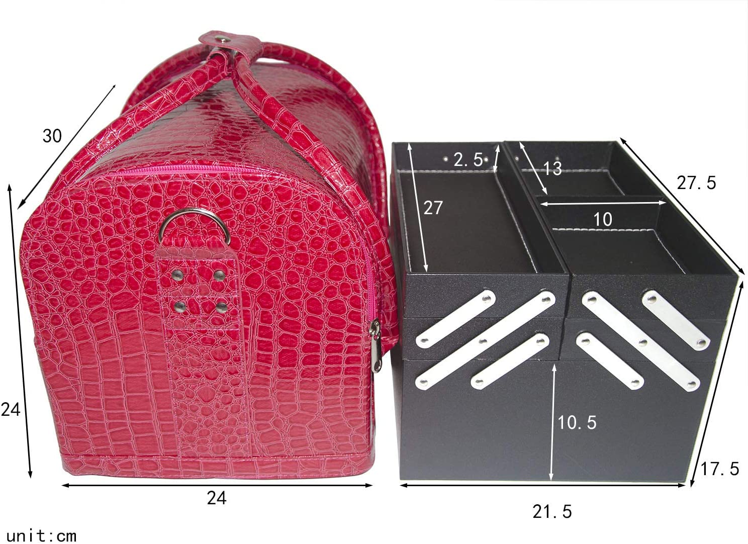 - Hecho de piel sintética de PVC de buena calidad con forro de poliéster, resistente al agua, fácil de limpiar y mantener, tamaño total de la caja de maquillaje aproximadamente: 30 x 24 x 24 centímetros (largo x ancho x alto), tamaño de la caja interna aproximadamente: 27.5 x 21.5 x 17.5 centímetros (Largo X Ancho x Altura)